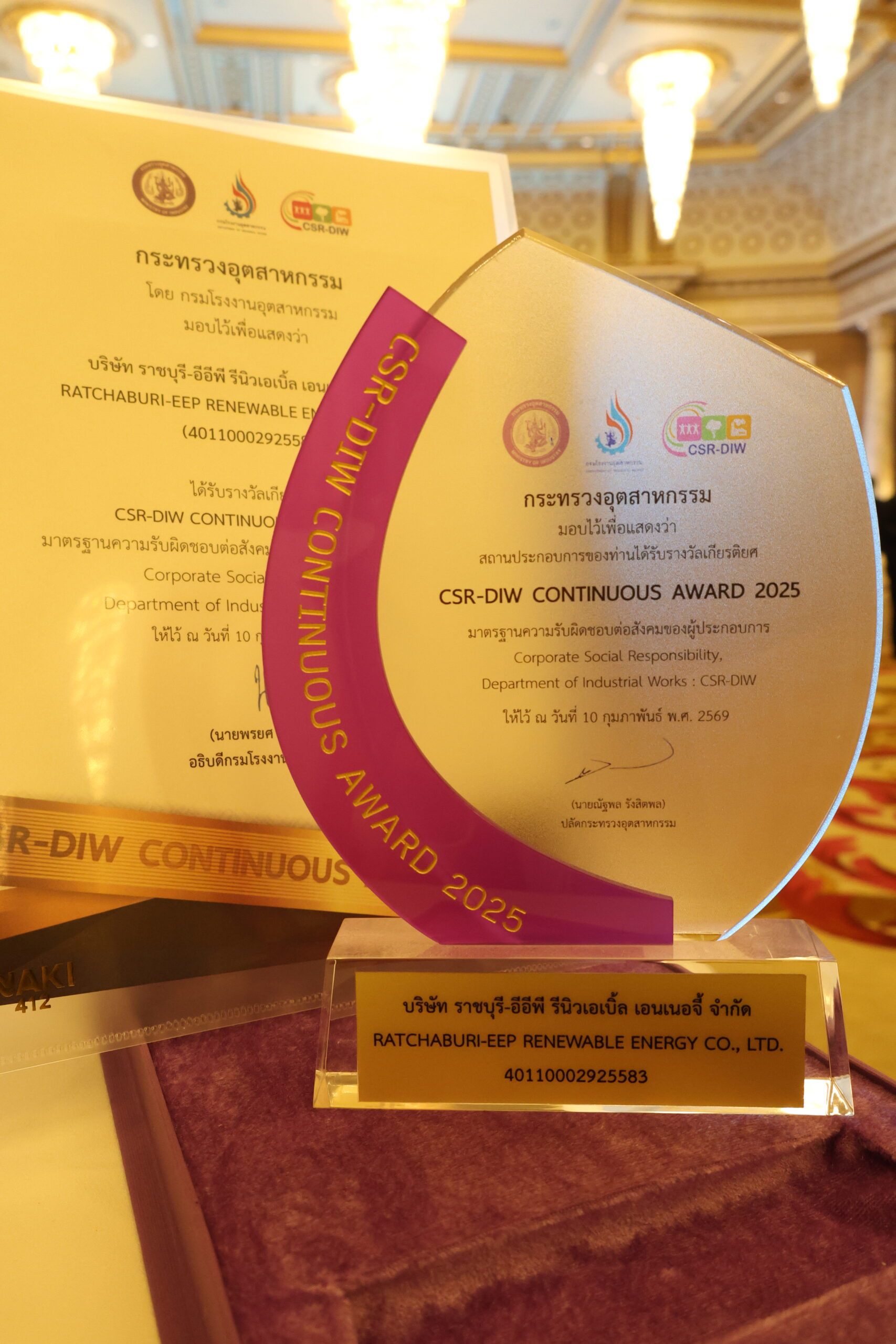 โรงไฟฟ้า บริษัท ราชบุรี-อีอีพี รีนิวเอเบิ้ล เอนเนอจี้ จำกัด คว้ารางวัล CSR-DIW Award 3 ปีซ้อนตอกย้ำต้นแบบโรงไฟฟ้าขยะชุมชนอย่างยั่งยืน